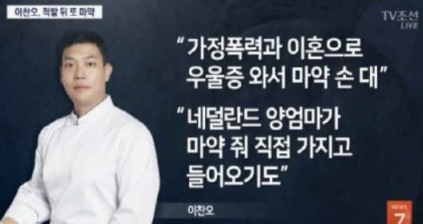 이찬오는 가정폭력과 이혼으로 우울증이 와서 마약에 손을 댓다고 합니다.